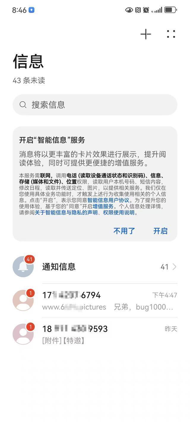 对于这类诱骗型的,我们很好防备的,正好我晚上刚好看了看手机,就有两个不正常的短信,其实我的是华为鸿蒙系统,在此之前已经帮我屏蔽了31个不正常信息,余下这两个,我通常的做法是,看都不看,直接选择删除。