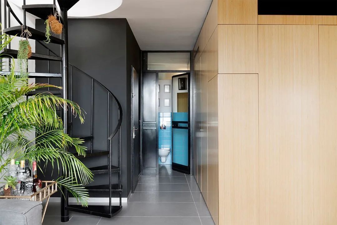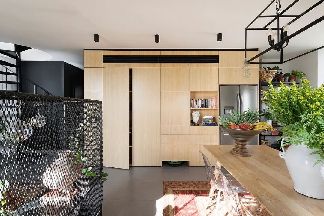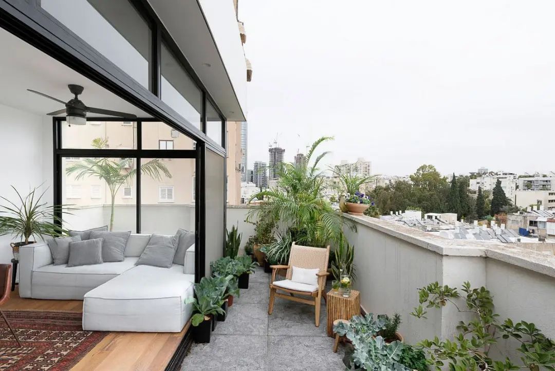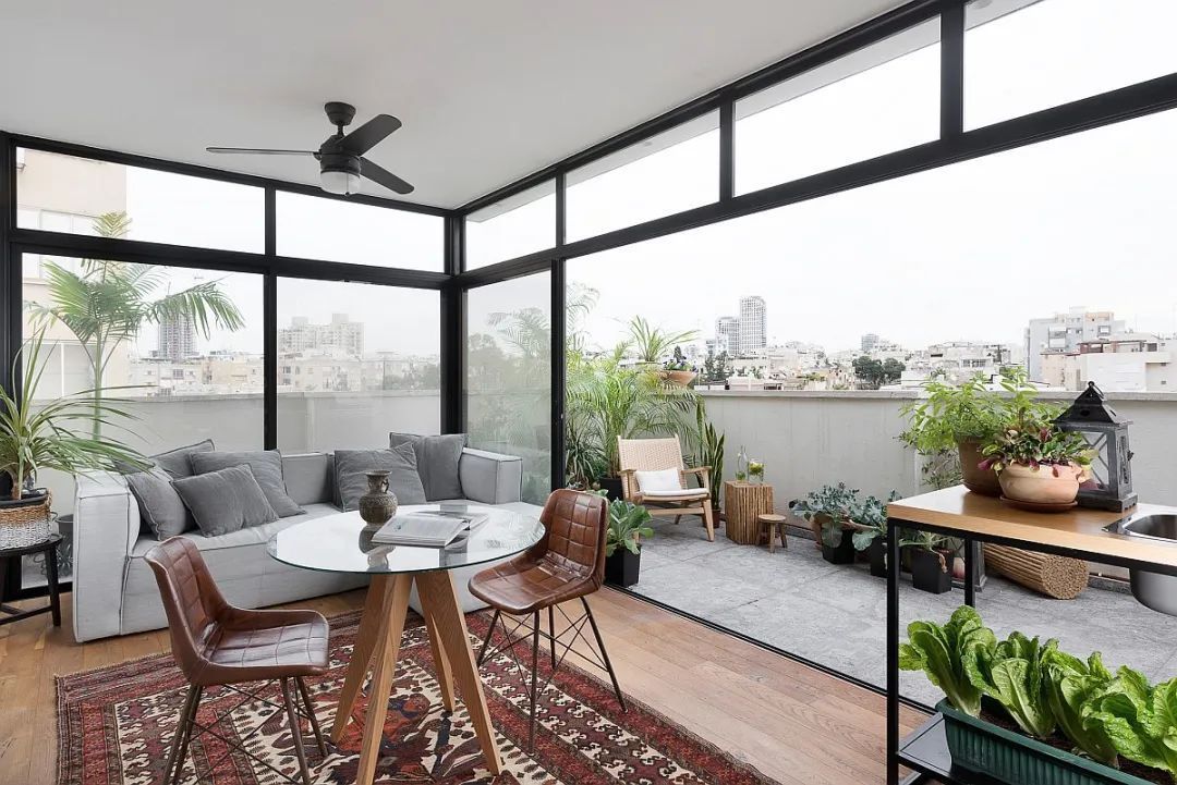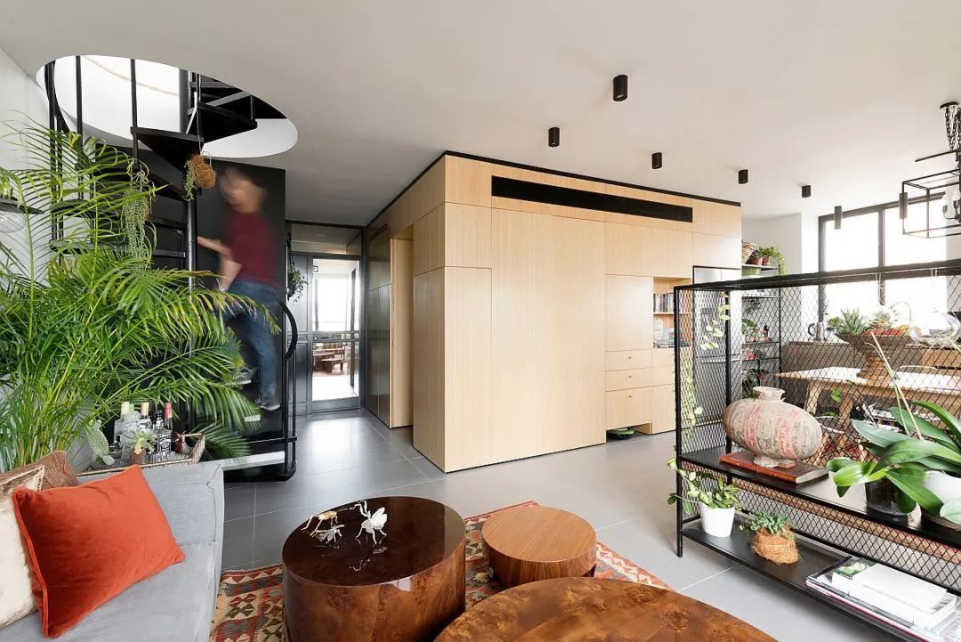 顶层被打造成一个拥有落地窗的明亮休闲客厅,创造出宽敞且充满光线的空间。此外,顶层还预留出一部分区域设为露台,铺上水泥地,并以花草装点,使其比拥有多个阳台的住宅更具优势,看完之后,我都想要购买这样的顶层公寓。