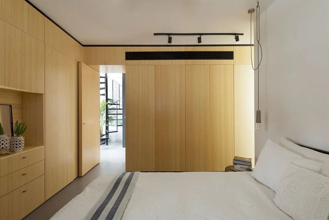 卧室巧妙地将一面墙壁改造成衣帽间,这个从地板到天花板的柜子,足以存放他们全家一年四季的衣物。